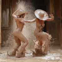 In "Echoes of Earth," the artist captures a striking scene of unity with nature, where the woman’s body is cloaked in wet clay, merging her with the very essence of the earth. Her pose, graceful yet powerful, conveys a blend of vulnerability and strength, as if she’s emerging from the mud reborn or embodying an elemental force. The layering of multiple reflections around her creates a sense of movement and multiplicity, suggesting a dance of identity, freedom, and connection to the primal. Her red lips provide a bold contrast, drawing the viewer’s attention to her expression, which is serene and introspective amid the earthy chaos.